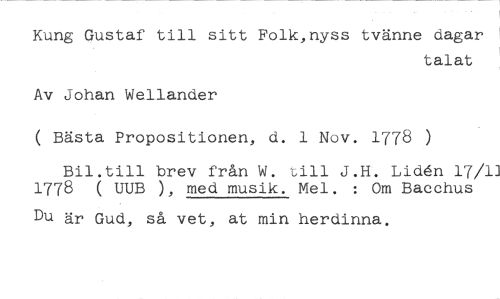 Kung Gustaf till sitt Folk,nyss tvänne dagar //// talat //// Av Johan Wellander //// ( Bästa Propositionen, d. 1 Nov. 1778 ) //// Bil.till brev från W. till J.H. Lid61 17/1] 1778 ( UUB ), med musik. Mel. : Om Bacchus //// Du är Gud, så vet, at min herdinna.