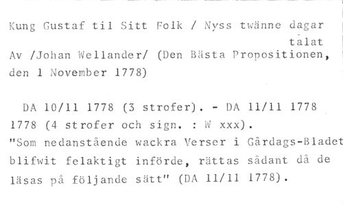 Kung Gustaf til Sitt Folk / Nyss twänne dagar //// talat //// Av /Johan Wellander/ (Den Bästa Propositionen, //// den 1 November 1778) //// DA 10/11 1778 (3 strofer). - DA 11/11 1778 1778 (4 strofer och sign. : W xxx). //// "Som nedanstående wackra Verser i Gårdags-Bladet blifwit felaktigt införde, rättas sådant då de läsas på följande sätt" (DA 11/11 1778).