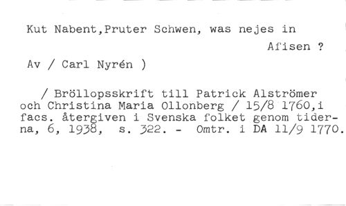 Kut Nabent,Pruter Schwen, was nejes in //// Afisen //// Av / Carl Nyr61 ) //// / Bröllopsskrift till Patrick Alströmer och Christina Maria 011onberg / 15/8 1760,i facs. återgiven i Svenska folket genom tiderna, 6, 1938, s. 322. - Omtr. i DA 11/9 1770.