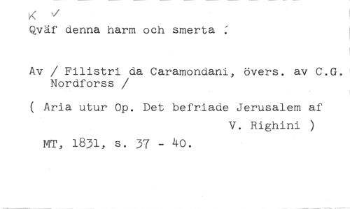 K v //// Qväf denna harm och smerta //// Av / Filistri da Caramondani, övers, av C.G. Nordforss //// /( Aria utur Op. Det befriade Jerusalem af //// V. Righini ) //// MT, 1831, s. 37 - 40.
