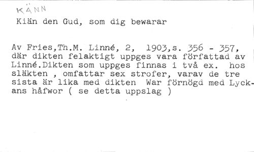 YLY //// Kiän den Gud, som dig bewarar //// Av Fries,Th.M. Linn6, 2, 1903,s. 356 - 357, där dikten felaktigt uppges vara författad av Linn.Dikten som uppges finnas i två ex. hos släkten , omfattar sex strofer, varav de tre sista är lika med dikten War förnögd med Lyckans håfwor ( se detta uppslag )