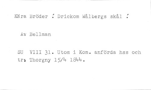 Kära Bröder : Drickom Wålbergs skål : Av Bellman //// SU VIII 31. Utom i Kom. anförda hss och trs Thorgny 15/4 1844.