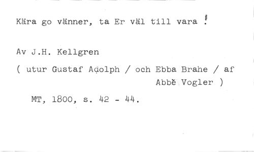 Kära go vänner, ta Er väl till vara . Av J.H. Kellgren //// ( utur Gustaf Aciolph / och Ebba Brahe / af //// ÅMA Vogler ) //// MT, 1800, s. 42 - 44.
