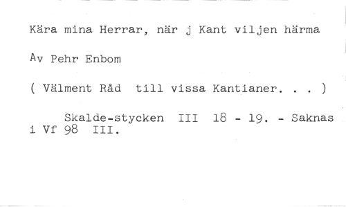 Kära mina Herrar, när j Kant viljen härma Av Pehr Enbom //// ( Välment Råd till vissa Kantianer. . //// Skalde-stycken III 18 - 19. - Saknas i Vf 98 III.