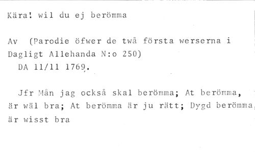 Kära! wil du ej berömma //// Av (Parodie öfwer de twå första werserna i Dagligt Allehanda N:o 250) DA 11/11 1769. //// Jfr Mån jag också skal berömma; At berömma, är wäl bra; At berömma är ju rätt; Dygd berömma, är wisst bra