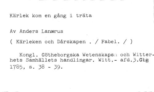 Kärlek kom en gång i träta //// Av Anders Lansrus //// ( Kärleken och Dårskapen . / Fabel. / ) //// Kongl. Götheborgska Wetenskaps,' och Witterhets Samhällets handlingar. Witt.- afd.3.Gbg //// 1785, s. 38 - 39.