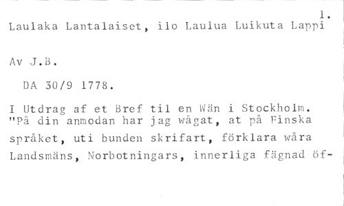 1. //// Laulaka Lantalaiset, ilo Laulua Luikuta Lappi //// Av J.B. //// DA 30/9 1778. //// I Utdrag af et Bref til en Wän i Stockholm. "På din anmodan har jag wågat, at på Finska //// språket, uti bunden skrifart, förklara våra Landsmäns, Norbotningars, innerliga fägnad öf-