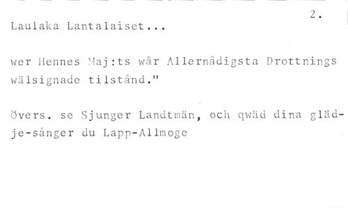 2. //// Laulaka Lantalaiset... //// wer Hennes Maj:ts wår Allernådigsta Drottnings wälsignade tilstånd." //// Övers. se Sjunger Landtmän, och qwäd dina glädje-sånger du Lapp-Allmoge