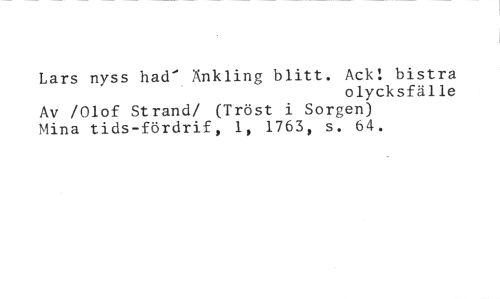 Lars nyss had' Änkling blitt. Ack! bistra //// olycksfälle //// Av /Olof Strand/ (Tröst i Sorgen) //// Mina tids-fördrif, 1, 1763, s. 64.