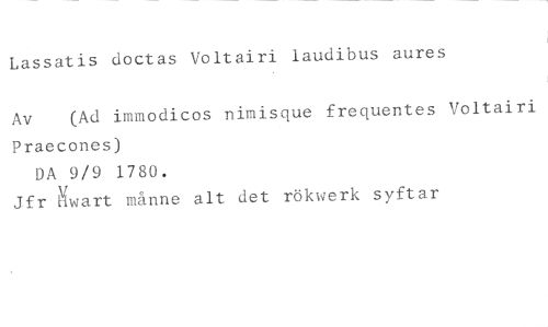 Lassatis doctas Voltairi laudibus aures //// Av (Ad immodicos nimisque frequentes Voltairi //// Praecones) //// DA 9/9 1780. //// V //// Jfr liwart månne alt det rökverk syftar