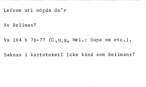 Lefvom uti nögda da'r //// Av Bellman? //// Vs 104 b 76-77 (Ctm,B, Mel.: Supa om etc.). //// Saknas i kartoteket! Icke känd som Bellmans?