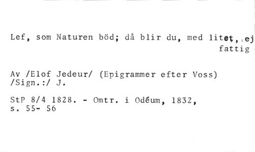 Lef, som Naturen böd; då blir du, med litet„ej //// fattig //// Av /Elof Jedeur/ (Epigrammer efter Voss) /Sign.:/ J. //// StP 8/4 1828. - Omtr. i Od6um, 1832, s. 55- 56