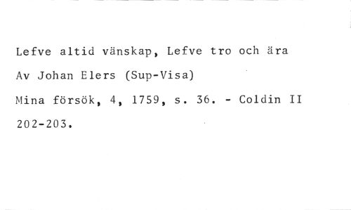 Lefve altid vänskap, Lefve tro och ära Av Johan Elers (Sup-Visa) //// Mina försök, 4, 1759, s. 36. - Coldin II 202-203.