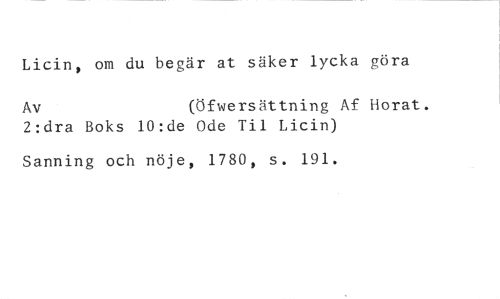 Licin, om du begär at säker lycka göra //// Av (Öfwersättning Af Horat. //// 2:dra Boks 10:de Ode Til Licin) //// Sanning och nöje, 1780, s. 191.