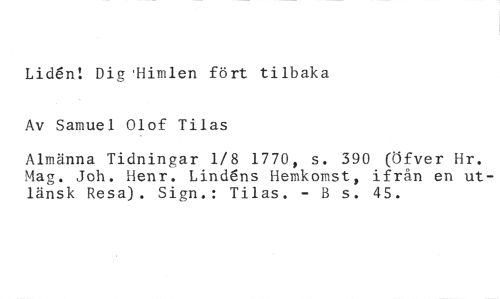 Lid6n! Dig .Himlen fört tilbaka Av Samuel Olof Tilas //// Almänna Tidningar 1/8 1770, s. 390 (Öfver Hr. Mag. Joh. Henr. Lind6ns Hemkomst, ifrån en utlänsk Resa). Sign.: Tilas. - B s. 45.
