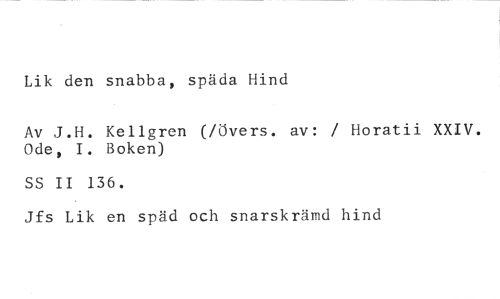 Lik den snabba, späda Hind //// Av J.H. Kellgren (/övers. av: / Horatii XXIV. Ode, I. Boken) //// SS II 136. //// Jfs Lik en späd och snarskrämd hind