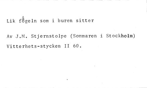Lik fågeln som i buren sitter //// Av J.M. Stjernstolpe (Sommaren i Stockholm) Vitterhets-stycken II 60.