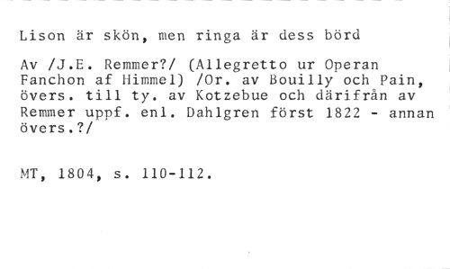 Lison är skön, men ringa är dess börd //// Av /J.E. Remmer?/ (Allegretto ur Operan Fanchon af Himmel) /Or. av Bouilly och Pain, övers. till ty. av Kotzebue och därifrån av Remmer uppf. enl. Dahlgren först 1822 - annan övers.? //// /MT, 1804, s. 110-112.