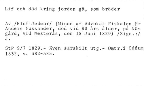 Lif och död kring jorden gå, som bröder //// Av /Elof Jedeur/ (Minne af Advokat Fiskalen Hr Anders Gussander, död vid 90 års ålder, på Näs gård, vid Westerås, den 15 Juni 1829) /Sign.:/ J. //// StP 9/7 1829.- Även särskilt utg.- Omtr.i Odgum 1832, s. 382-385.