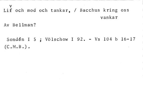 v //// Lif och mod och tankar, / Bacchus kring oss //// vankar //// Av Bellman? //// Sond6n I 5 ; Völschow I 92. - Vs 104 b 16-17 (C.M.B.).