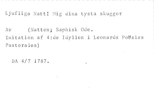 Ljufliga Natt! Mig dina tysta skuggor //// Av (Natten; Saphisk Ode. //// Imitation af 4:de Idyllen i Leonards PoUsies Pastorales) //// DA 4/7 1787.