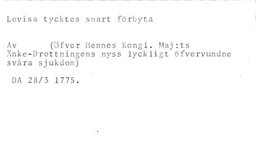 Lovisa tycktes snart förbyta //// Av (Öfver Hennes Kongl. Maj:ts //// Xnke-Drottningens nyss lyckligt öfvervundne svåra sjukdom) //// DA 28/3 1775.