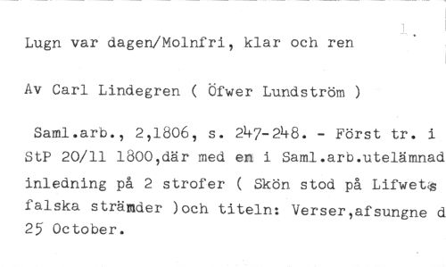 Lugn var dagen/Molnfri, klar och ren Av Carl Lindegren ( Öfwer Lundström ) //// Saml.arb., 2,1806, s. 247-248. - Först tr. i StP 20/11 1800,där med en i Saml.arb.utelämnad //// inledning på 2 strofer ( Skön stod på Lifwets //// falska strämder )och titeln: Verser,afsungne d 25 October.