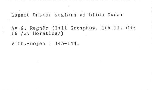 Lugnet önskar seglarn af blida Gudar //// Av G. Regn6r (Till Grosphus. Lib.II. Ode 16 /av Horatius/) //// Vitt.-nöjen I 143-144.