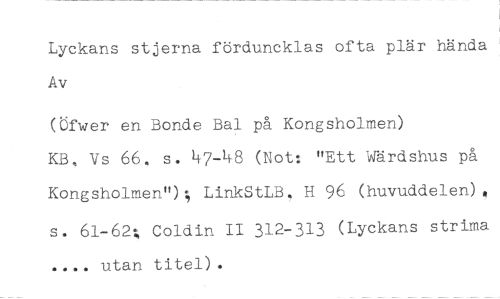Lyckans stjerna förduncklas ofta plär hända Av //// (Öfwer en Bonde Bal på Kongsholmen) //// KB, Vs 66. s. 47-48 (Not: "Ett Wärdshus på Kongsholmen"); LinkStLB, H 96 (huvuddelen)," s. 61-62; Coldin II 312-313 (Lyckans strima .... utan titel).