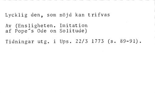 Lycklig den, som nöjd kan trifvas //// Av (Ensligheten. Imitation af Pope's Ode on Solitude) //// Tidningar utg. i Ups. 22/3 1773 (s. 89-91).
