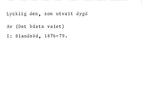 Lycklig den, som utvalt dygd //// Av (Det bästa valet) I: Blandsäd, 1876-79.