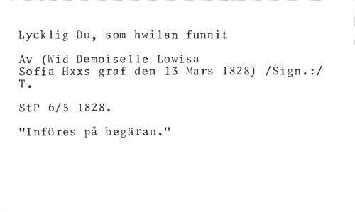 Lycklig Du, som hwilan funnit //// Av (Wid Demoiselle Lowisa //// Sofia Hxxs graf den 13 Mars 1828) /Sign.:/ T. //// StP 6/5 1828. //// "Införes på begäran."