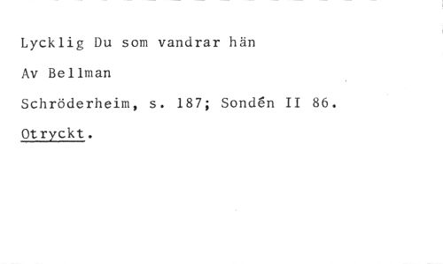 Lycklig Du som vandrar hän //// Av Bellman //// Schröderheim, s. 187; Sonden II 86. Otryckt.