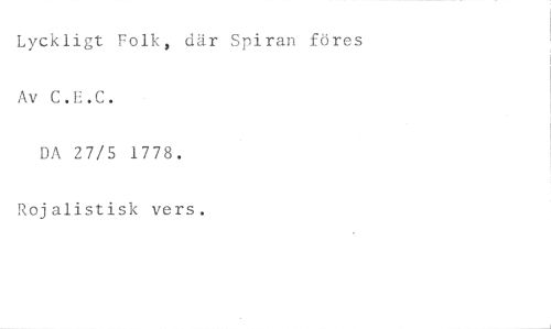 Lyckligt Folk, där Spiran föres Av C.E.C. //// DA 27/5 1778. //// Rojalistisk vers.