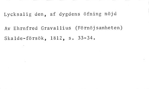 Lycksalig den, af dygdens öfning nöjd //// Av Ehrnfred Gravallius (Förnöjsamheten) Skalde-försök, 1812, s. 33-34.