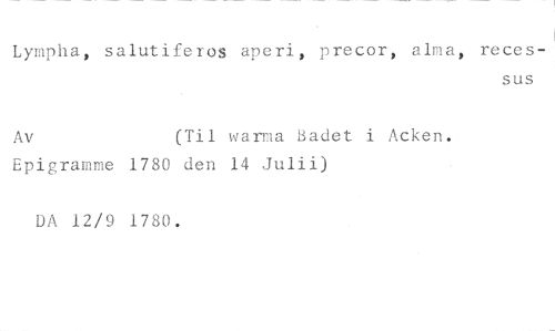 Lympha, salutiferos aperi, precor, alma, reces- //// sus //// Av (Til warma Badet i Acken. //// Epigramme 1780 den 14 Julii) //// DA 12/9 1780.