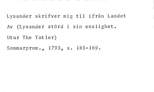 Lysander skrifver mig til ifrån Landet Av (Lysander störd i sin enslighet. Utur The Tat ler) //// Sommarprom., 1793, s. 165-169.
