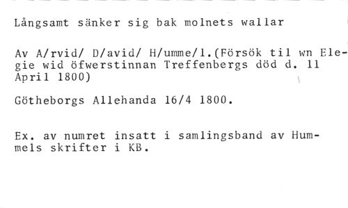 Långsamt sänker sig bak molnets wallar //// Av A/rvid/ D/avid/ H/umme/1.(Försök til wn Elegie wid öfwerstinnan Treffenbergs död d. 11 April 1800) //// Götheborgs Allehanda 16/4 1800. //// Ex. av numret insatt i samlingsband av Hummels skrifter i KB.