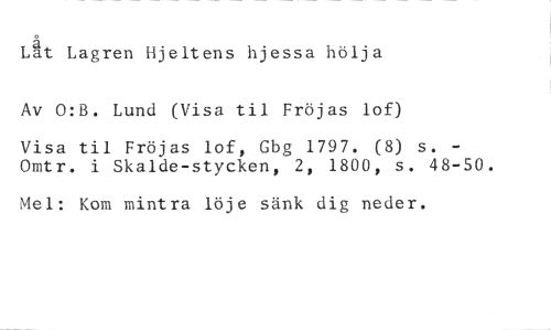 Låt Lagren Hjeltens hjessa hölja //// Av 0:B. Lund (Visa til Fröjas lof) //// Visa til Fröjas lof, Gbg 1797. (8) s. Omtr. i Skalde-stycken, 2, 1800, s. 48-50. //// öfel: Kom mintra löje sänk dig neder.
