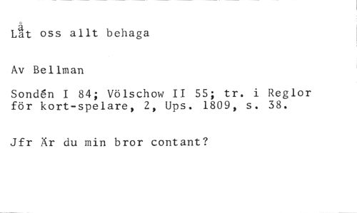 Låt oss allt behaga Av Bellman //// Sonden I 84; Völschow II 55; tr. i Reglor för kort-spelare, 2, Ups. 1809, s. 38. //// Jfr Är du min bror contant?
