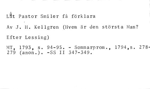 Lit Pastor Smiler få förklara //// Av J. H. Kellgren (Hvem är den största Man? Efter Lessing) //// MT, 1793, s. 94-95. - Sommarprom., 1794,s. 278279 (anon.). -SS II 347-349.