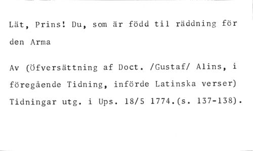 Lät, Prins! Du, som är född til räddning för den Arma //// Av (Öfversättning af Doct. /Gustaf/ Alins, i föregående Tidning, införde Latinska verser) Tidningar utg. i Ups. 18/5 1774.(s. 137-138).