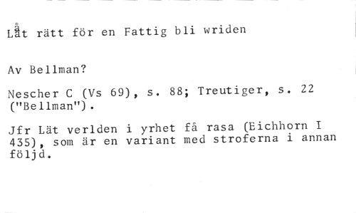 Lät rätt för en Fattig bli wriden Av Bellman? //// Nescher C (Vs 69), s. 88; Treutiger, s. 22 ("Bellman"). //// Jfr Lät verlden i yrhet få rasa (Eichhorn I 435), som är en variant med stroferna i annan följd.