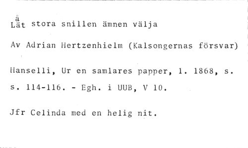 Lät stora snillen ämnen välja //// Av Adrian Hertzenhielm (Kalsongernas försvar) //// Hanselli, Ur en samlares papper, 1. 1868, s. s. 114-116. - Egh. i UUB, V 10. //// Jfr Celinda med en helig nit.