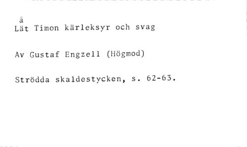 Lät Timon kärleksyr och svag //// Av Gustaf Engzell (Högmod) //// Strödda skaldestycken, s. 62-63.