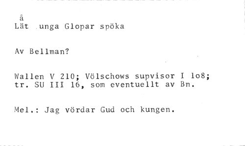 a //// Lät .unga Glopar spöka //// Av Bellman? //// Wallen V 210; Völschows supvisor I 108; tr. SU III 16, som eventuellt av Bn. //// Mei.• Jag vördar Gud och kungen.