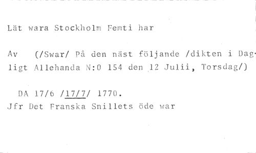 Lät wara Stockholm Femti har //// Av (/Swar/ På den näst följande /dikten i Dag- //// ligt Allehanda N:0 154 den .12 Julii, Torsdag/) //// DA 17/6 /17/7/ 1770. //// Jfr Det Franska Snillets öde war