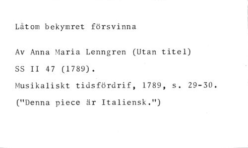 Lätom bekymret försvinna //// Av Anna Maria Lenngren (Utan titel) //// SS II 47 (1789). //// Musikaliskt tidsfördrif, 1789, s. 29-30. ("Denna piece är Italiensk.")