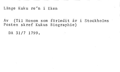 Länge Kuku ren i Eken //// Av (Til Honom som förledit år i Stockholms Posten skref Kukus Biographie) //// DA 31/7 1799.