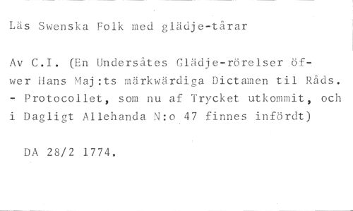 Läs Swenska Folk med glädje-tårar //// Av C.I. (En Undersåtes Glädje-rörelser öfwer Hans Maj:ts märkwärdiga Dictamen til Råds. - Protocollet, som nu af Trycket utkommit, och i Dagligt Allehanda N:o 47 finnes infördt) //// DA 28/2 1774.